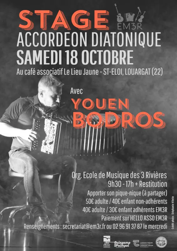 L’École de Musique des 3 Rivières (EM3R) organise un stage d’accordéon diatonique animé par Youen Bodros le samedi 18 octobre
